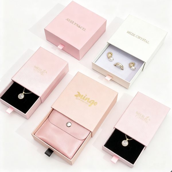 Paper jewelry boxes are easy to manufacture and can be created in various configurations, including flip-top, drawer, and lid styles. They can also be customized with hot stamping, UV treatments, lamination, and embossing, creating a rich visual and tactile experience.