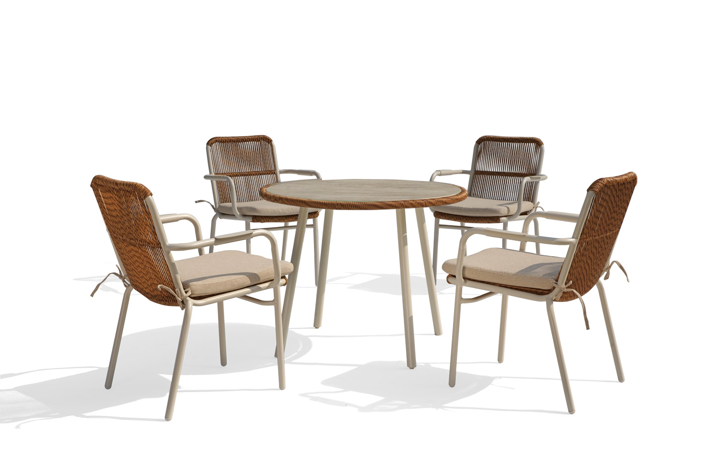 This outdoor dining set features hand-woven rattan craftsmanship combined with a cream white aluminum frame and a printed stone-look tempered glass tabletop. The warm tones of reddish-brown rope and beige cushions complement the frame beautifully, creating a natural and inviting aesthetic. Perfect for gardens, patios, terraces, and a variety of outdoor living spaces.